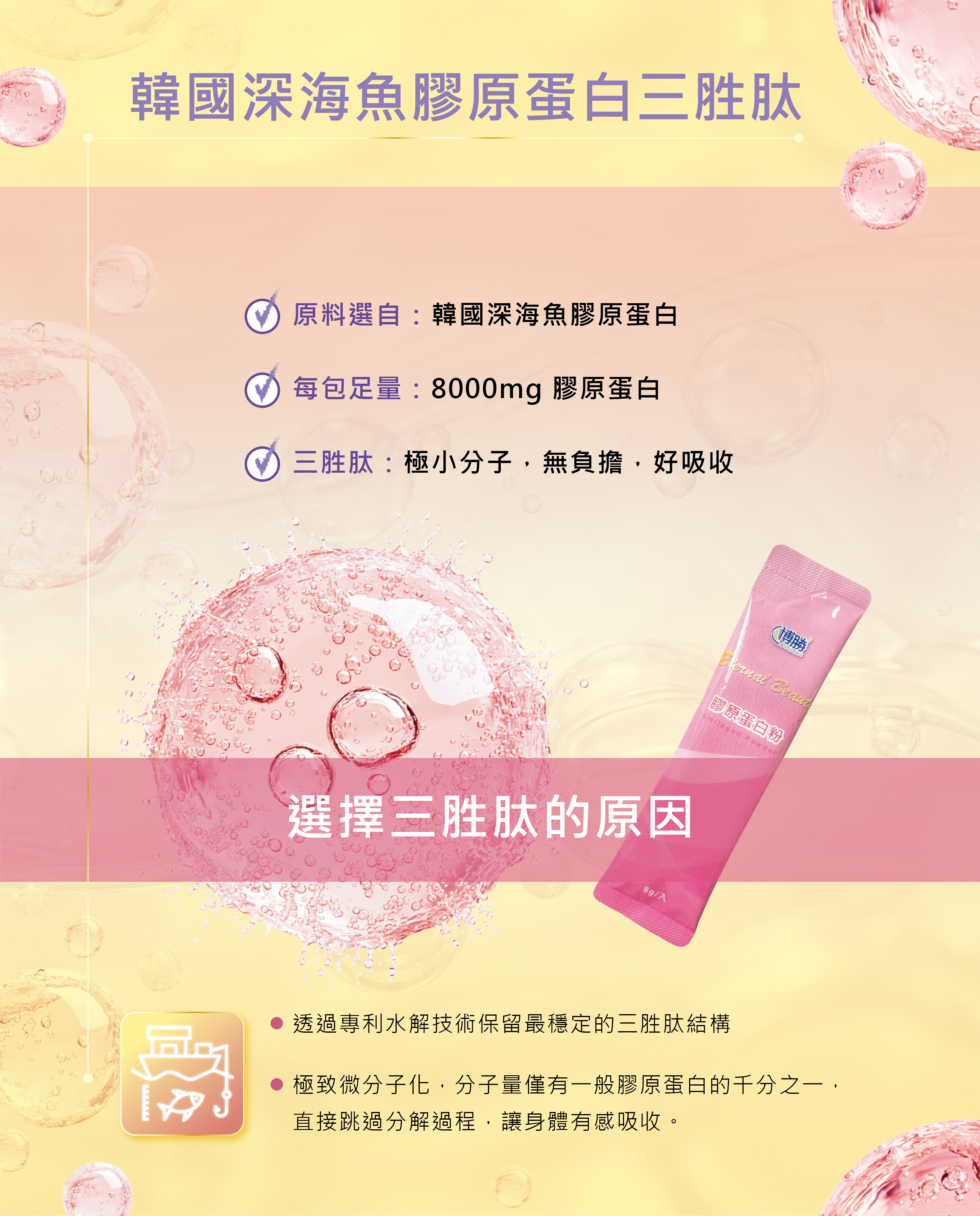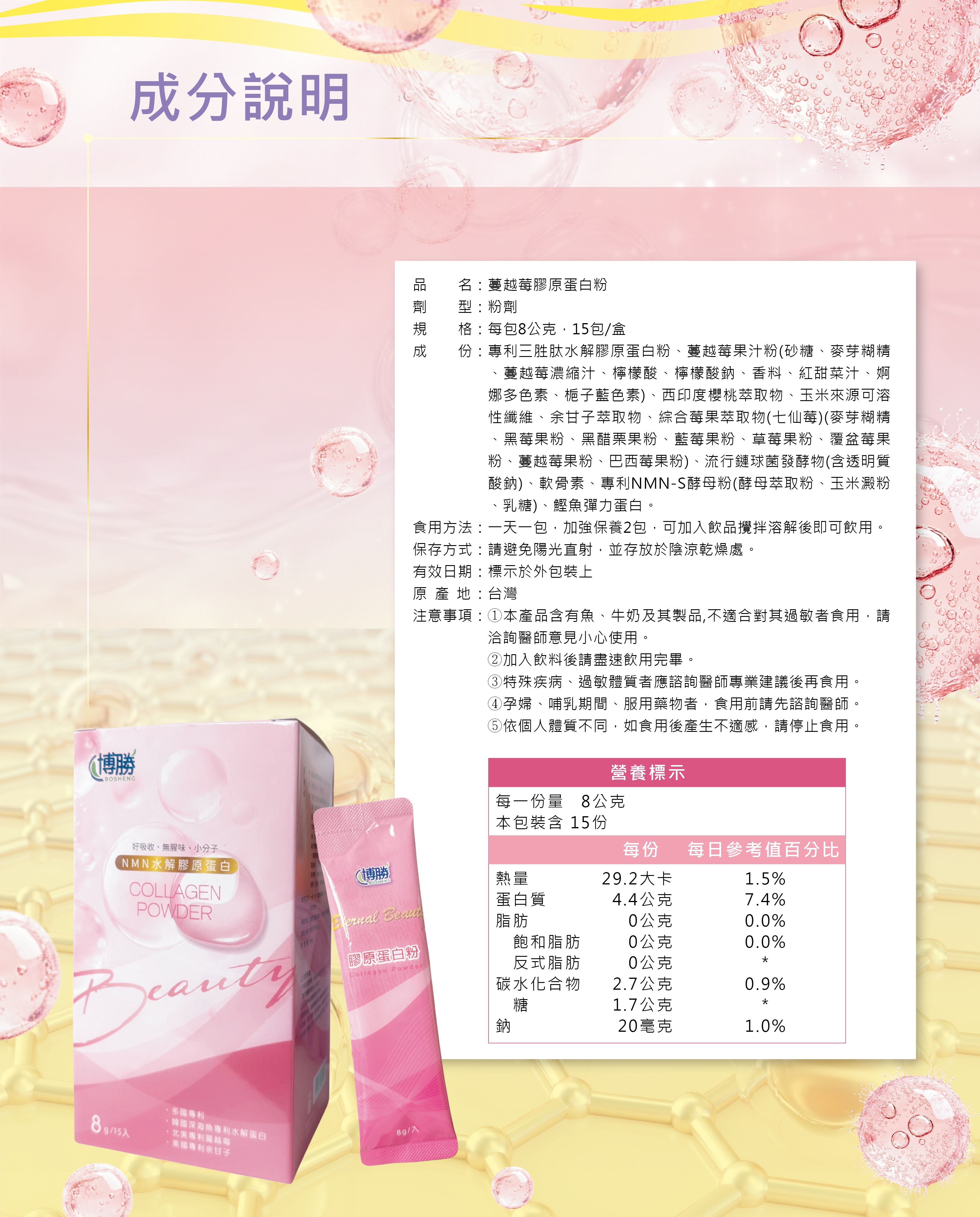 每包8g充足份量,小分子更好吸收,小包裝輕鬆攜帶。限時3盒超值組優惠中!